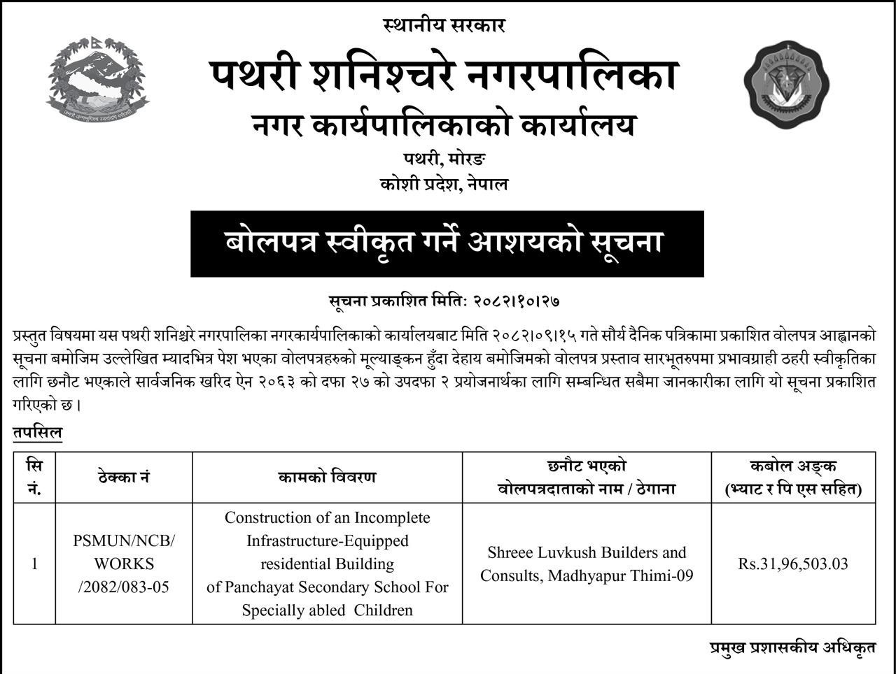 » बोलपत्र स्वीकृत गर्ने आशयको सुचना ।