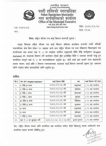 राष्ट्रिय परिचयपत्र कार्ड वितरण सम्बन्धी सूचना ।
