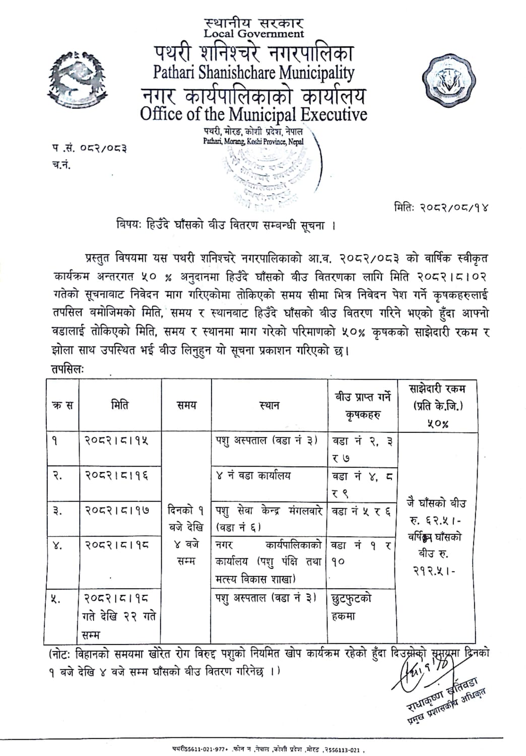 हिउँदे घाँस (जै र वर्सिम) को बिउ वितरण सम्बन्धी सूचना ।