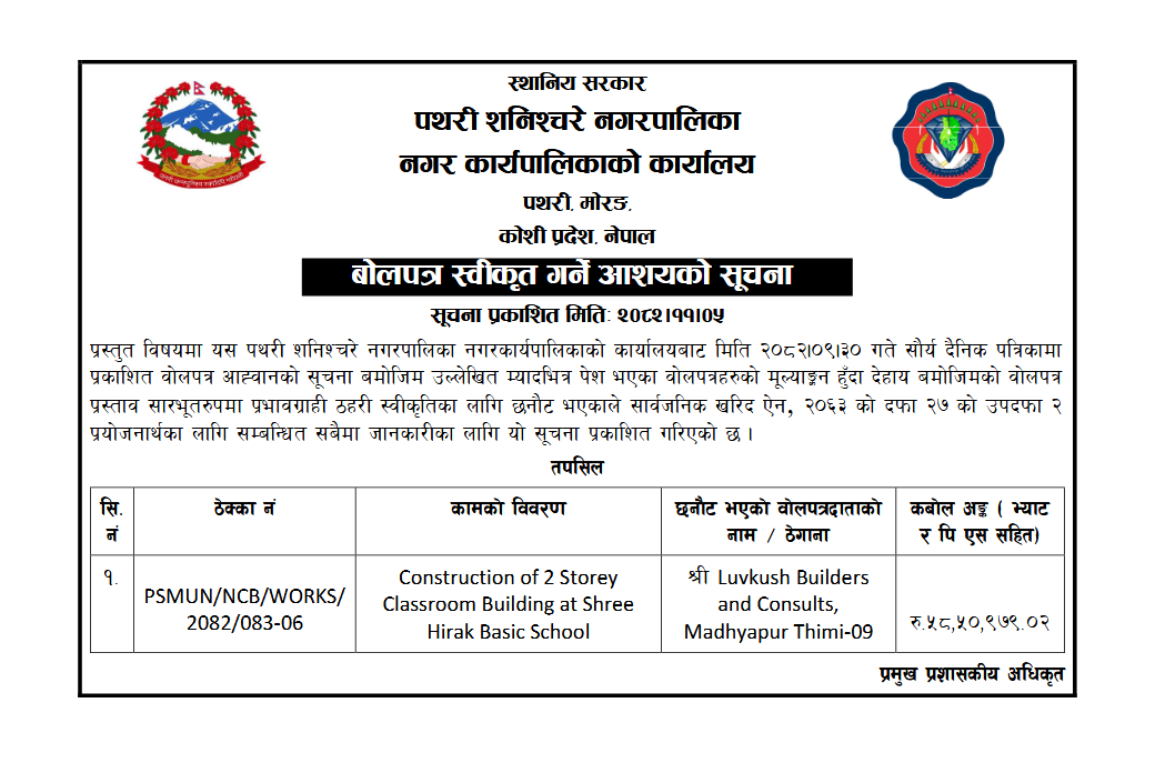 » बोलपत्र स्वीकृत गर्ने आशयको सुचना ।