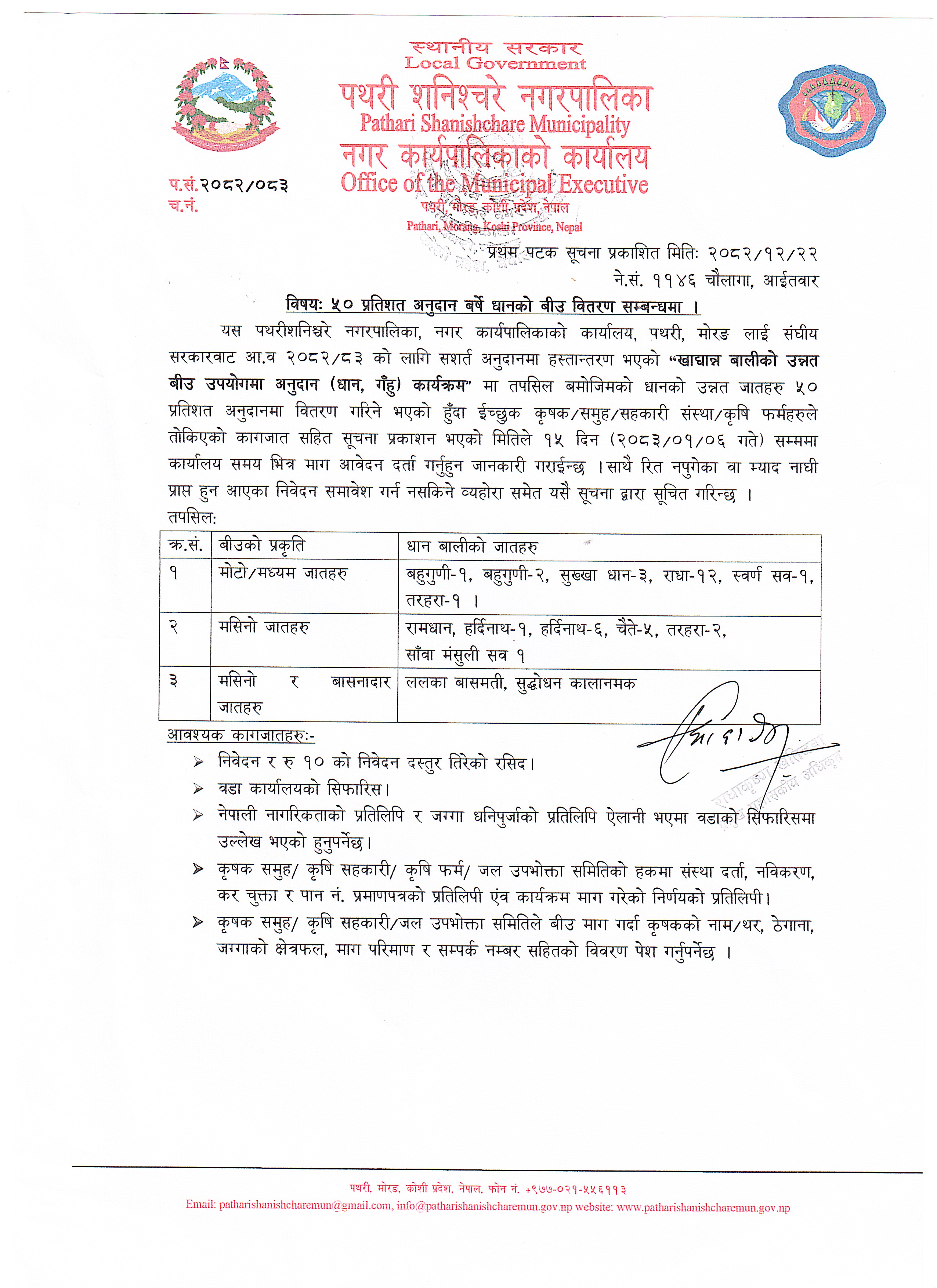 ५० प्रतिशत अनुदान बर्षे धानको बीउ वितरण सम्बन्धमा ।
