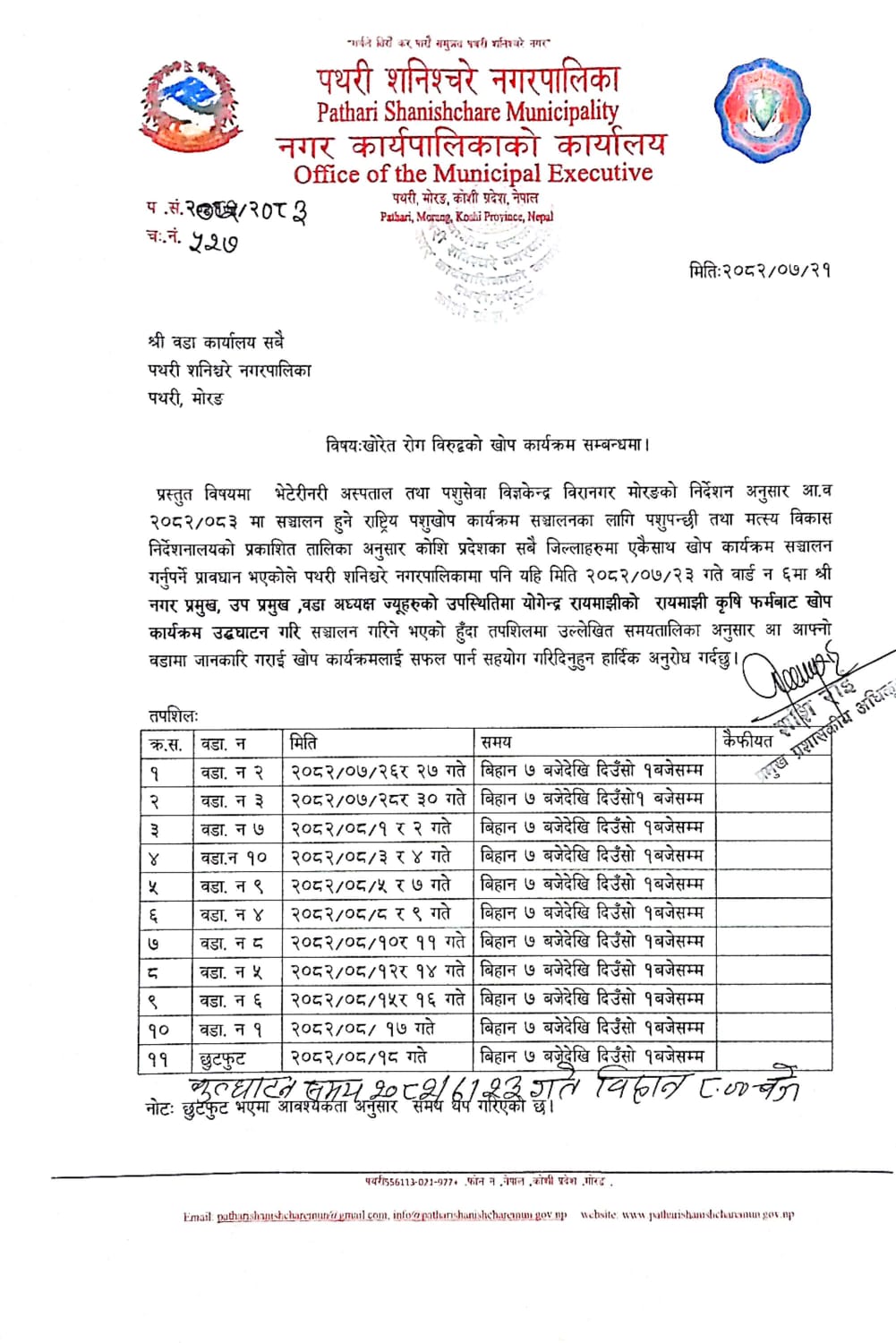 खोरेत रोग विरुद्वको खोप कार्यक्रम सम्बन्धमा ।