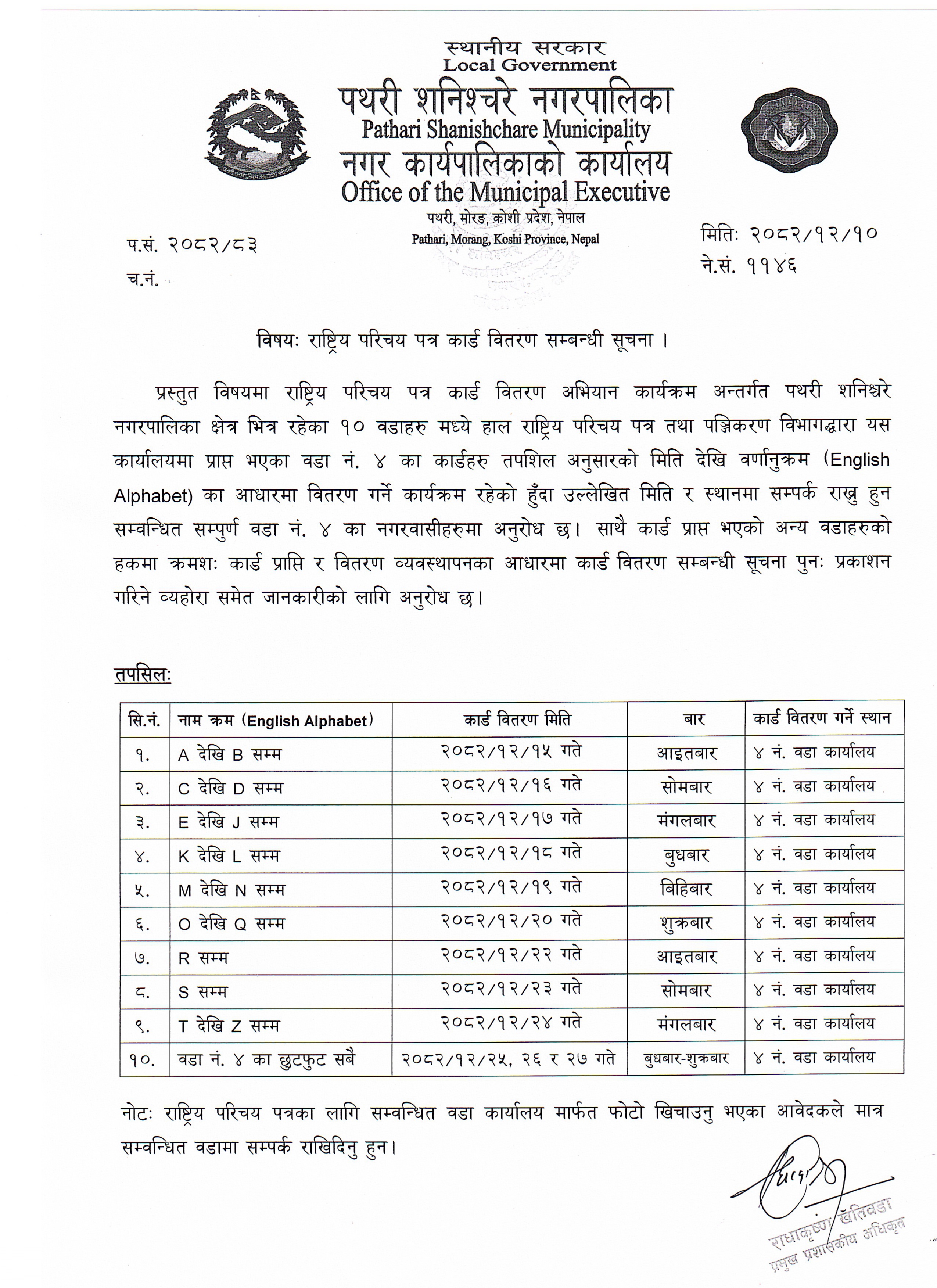 » राष्ट्रिय परिचयपत्र कार्ड वितरण सम्बन्धी सूचना ।
